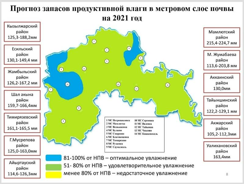 По информации гидрометеорологической службы, в регионе оптимальные условия прогнозируются в районе Шал акына и местами в районе М. Жумабаева, а также Тимирязевском и Жамбылском районах. В остальных районах запасы продуктивной влаги ожидаются в пределах 57-80% от наименьшей полевой влагоемкости (106-226 мм), что характеризуется как удовлетворительный уровень влагозапасов.