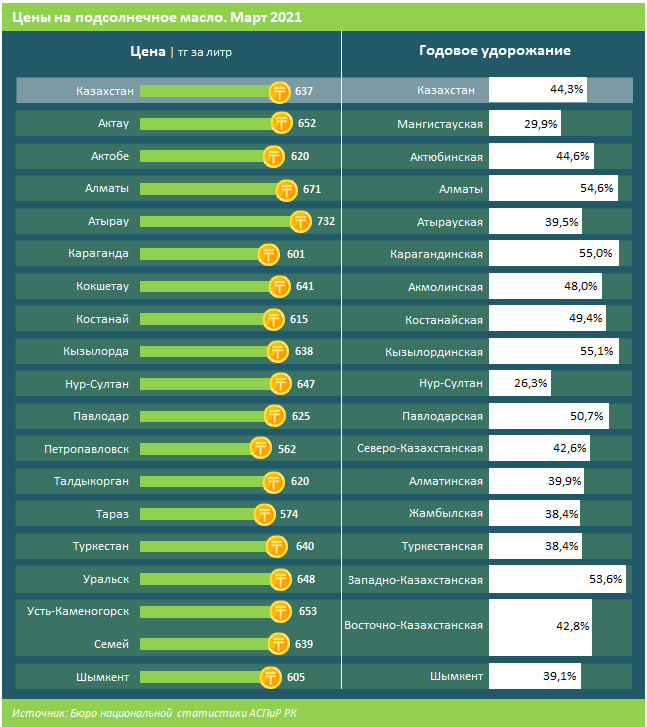 Дороже всего среди крупных городов страны подсолнечное масло стоило в Атырау: 732 тг за литр. Высокие цены отмечены также в Алматы и Усть-Каменогорске. Дешевле всего масло стоило в Петропавловске: 562 тг за литр.