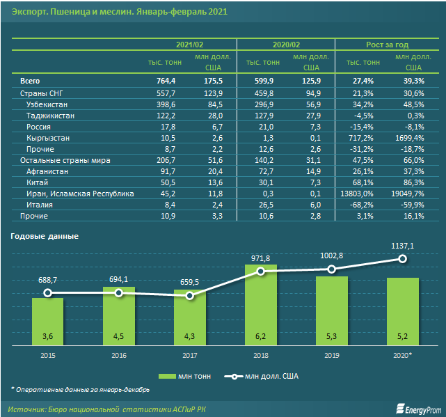 За январь-февраль текущего года компании страны отправили на экспорт 764,4 тыс. тонн пшеницы и меслина — на 27,4% больше, чем годом ранее. В денежном выражении экспорт достиг 175,5 млн долл. США, увеличившись на 39,3% за год.