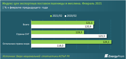 Экспортные цены на пшеницу по итогам февраля 2021 года выросли на 21,1% за год и на 0,6% — за месяц. Цены для стран СНГ выросли на 19,3% в годовой динамике, для остальных стран мира — на 24,1%.