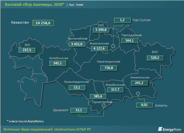 По итогам 2020 года валовой сбор пшеницы составил 14,3 млн тонн — на 24,5% больше, чем годом ранее. Больше всего урожая собрали в Акмолинской области: 4,1 млн тонн, плюс 25,3%. В тройку лидирующих регионов также вошли Костанайская и Северо-Казахстанская области.