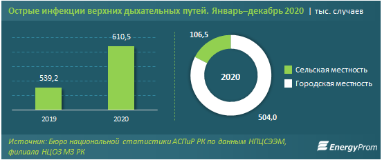 За январь–декабрь 2020 года в РК было зарегистрировано 610,5 тыс. случаев острой инфекции верхних дыхательных путей — сразу на 13,2% больше, чем в 2019 году.