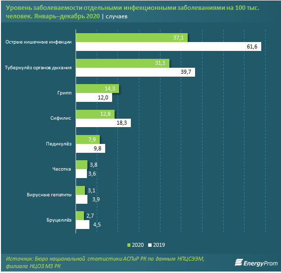 Уровень заболеваемости острыми кишечными инфекциями в 2020-м сократился на 39,8% за год, до 37,1 случая на 100 тыс. человек. Самые высокие показатели заболеваемости приходятся на Кызылординскую область (89,4 случая) и Нур-Султан (87,8 случая на 100 тыс. человек).
