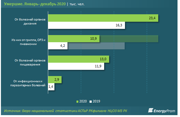 От болезней органов дыхания, по официальным данным, за январь–декабрь 2020 года умерли 23,4 тыс. человек — сразу на 43,4% больше по сравнению с аналогичным периодом прошлого года. Это 14,4% от общего числа умерших за 2020 год. Из них от гриппа, острых респираторных заболеваний (ОРЗ) и пневмонии умерли 10,9 тыс. человек — в 2,6 раза больше, чем за январь–декабрь 2019-го.