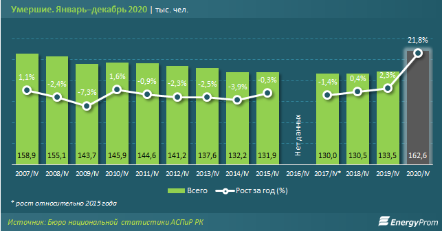 В «коронавирусном» 2020 году число умерших в РК увеличилось к докризисному 2019-му на аномальные 22%, сообщает Energyprom.kz.