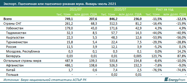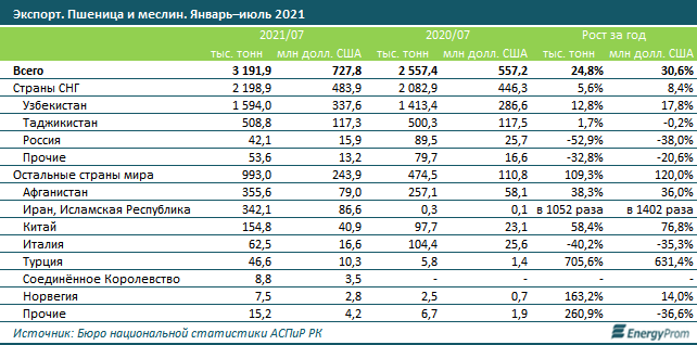 За январь–июль 2021 года из РК на экспорт отправили 3,2 млн тонн пшеницы на 727,8 млн долл. США. Рост в натуральном выражении составил 24,8%, в денежном — на 30,6%.