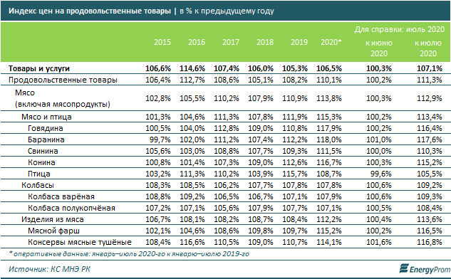 По итогам января–июля текущего года мясо и мясопродукты в РК подорожали к аналогичному периоду годом ранее сразу на 13,8%, непосредственно мясо и птица — на 15,3%. При этом в целом продовольственные товары выросли в цене за тот же период на 10,1%, а общий уровень инфляции составил всего 6,5%. По сути, по карманам казахстанцев в кризис и период пандемии значительнее всего бьёт рост цен на продовольствие — и не в последнюю очередь конкретно на мясо.