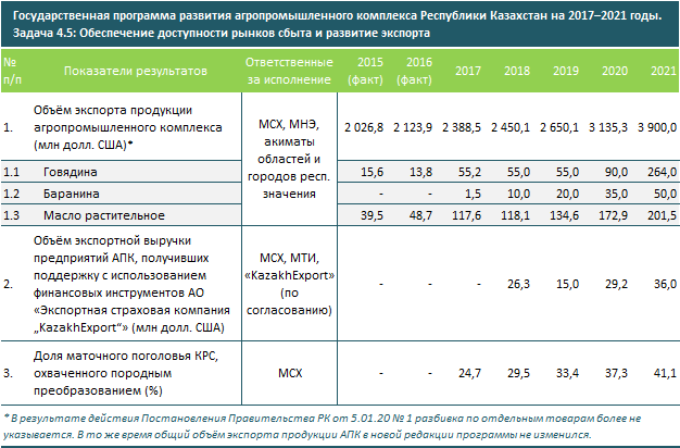 Что касается Госпрограммы развития агропромышленного комплекса, сложно сказать, насколько в полной мере достигнуты запланированные результаты. Например, в Программе на 2017–2021 годы в её изначальном виде были указаны конкретные цифры по запланированному экспорту говядины и баранины. Однако в результате Постановления Правительства РК от 5.01.20 № 1 разбивка по отдельным товарам более не указывается, хотя общий объём экспорта продукции АПК в новой редакции программы не изменился.