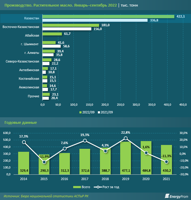 За январь–сентябрь 2022 года в РК произвели 422,1 тыс. тонн рафинированного и нерафинированного растительного масла — сразу на 25,3% больше, чем годом ранее.