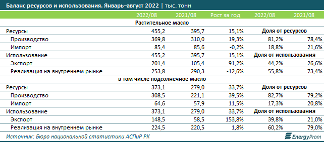 Экспорт масла вырос сразу в 1,9 раза, до 201,4 тыс. тонн, составив 44,2% от использованных ресурсов (для сравнения: годом ранее — 26,6%). Реализация растительного масла всех видов на внутреннем рынке РК составила 253,8 тыс. тонн — на 12,6% меньше, чем годом ранее.