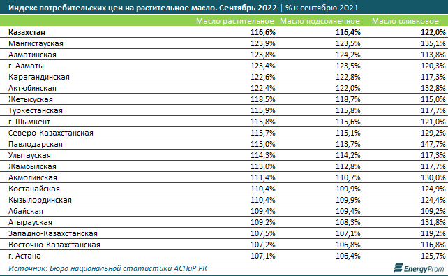 Сильнее всего рост цен на растительное масло ощутили жители Мангистауской области: на 23,9% за год. В тройке антилидеров также оказались Алматинская область (плюс 23,8% за год) и Алматы (плюс 23,4%). Наименьший годовой рост был зафиксирован в столице: на 7,1%.