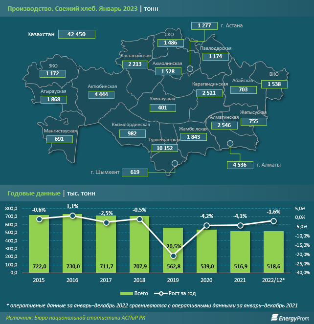 Самые большие объёмы производства были отмечены в Туркестанской области: 10,2 тыс. тонн, минус 0,9% за год. На этот регион пришлось 23,9% всего выпуска по стране. На второй и третьей строчках оказались Алматы (4,5 тыс. тонн, плюс 13,2%) и Актюбинская область (4,4 тыс. тонн). Меньше всего хлеба — всего 401 тонну — произвели в Улытауской области.